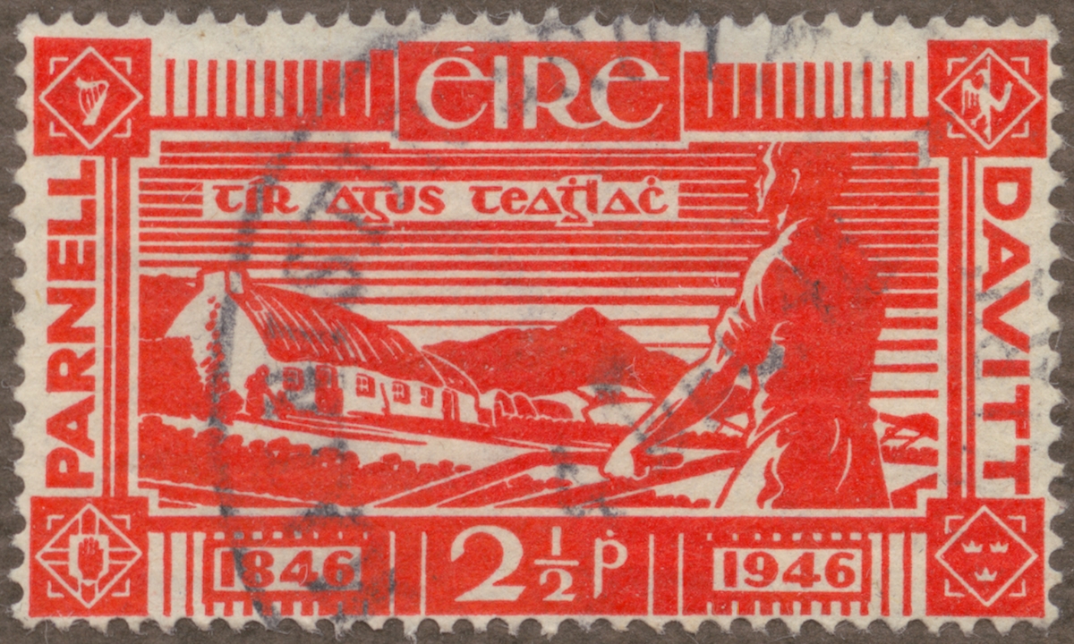 Frimärke från Irland, 1946. Motiv av Jordbruksarbetare. Plöjning. 100-årsminne av födelsedagen för politikerna Charles Parnell, 1846-1891. Michael Davitt 1846-1906.