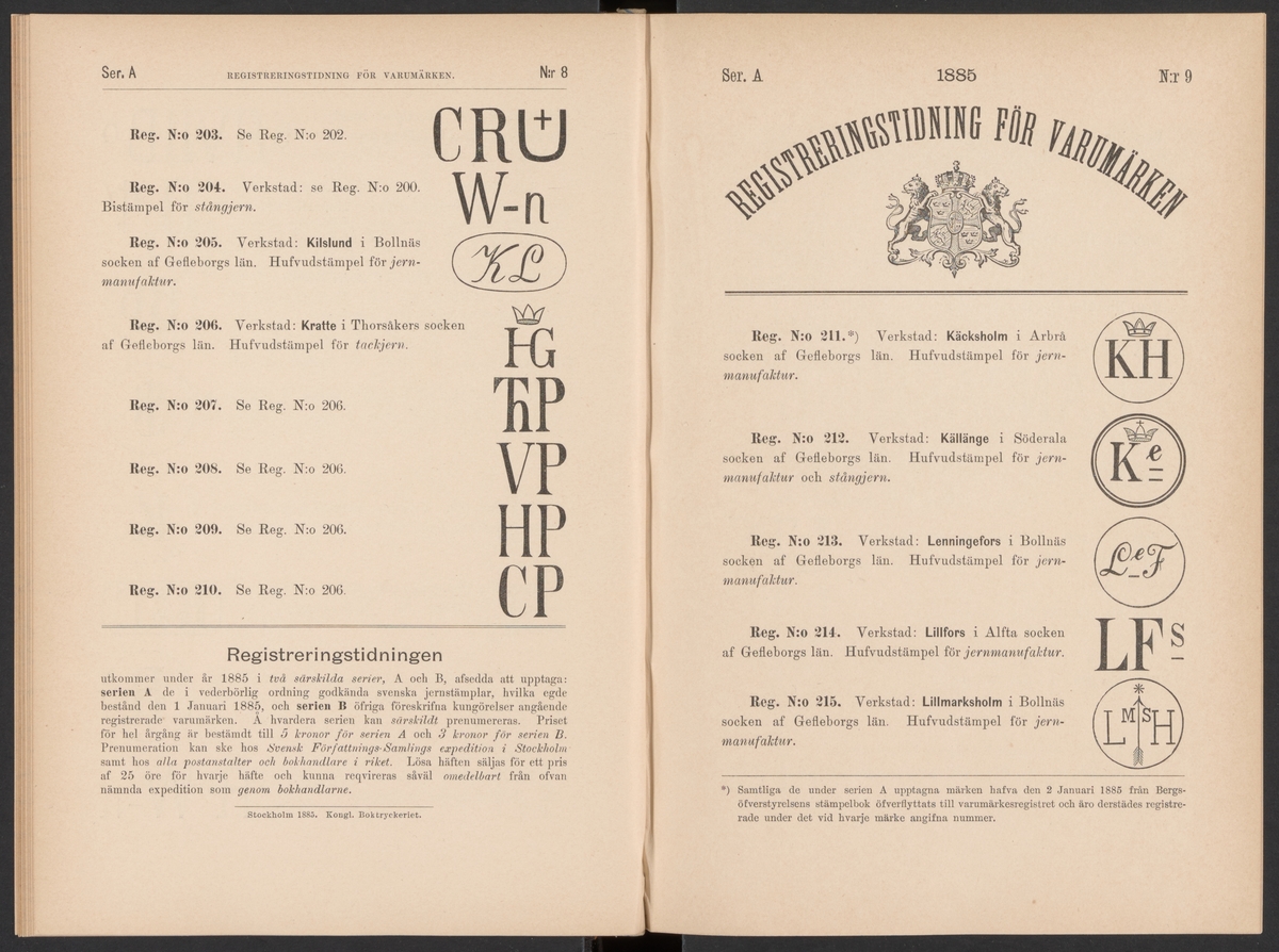 Registreringstidning för varumärken 1885. Serie A, Svenska järnstämplar.