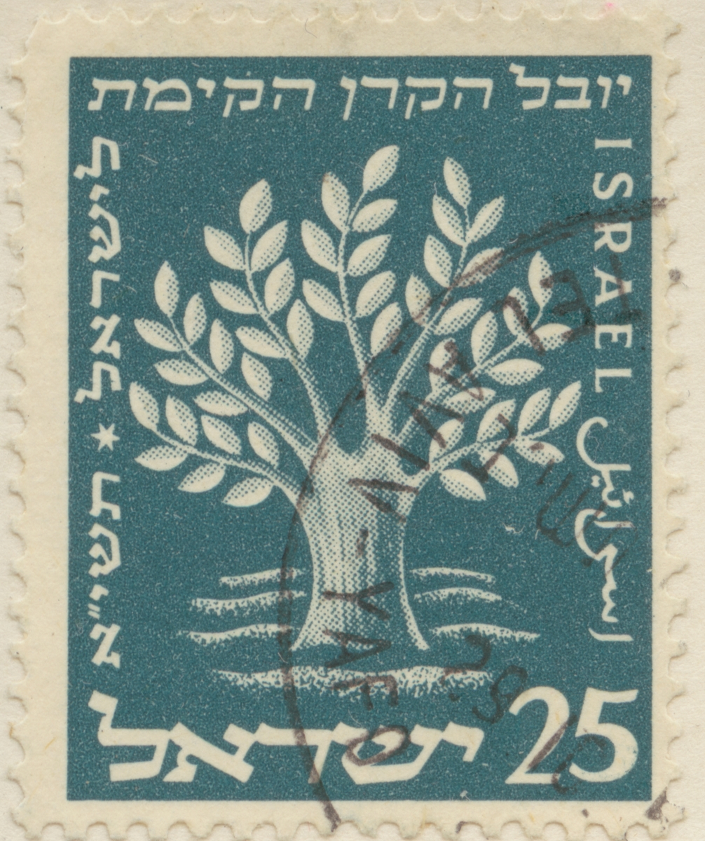 Frimärke från Israel, 1951. Motiv av gammal stubbe med färska grenar. Symbol. "50-årsminne av Hebretisk National Fondens stiftande: 1901-1951".