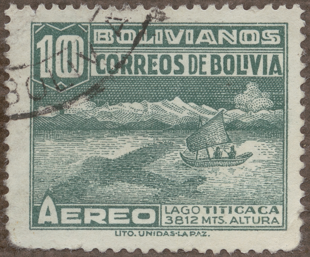Frimärke från Bolivia, 1941. Motiv av Segelbåt på Titicacasjön: -skugga av monoplan-