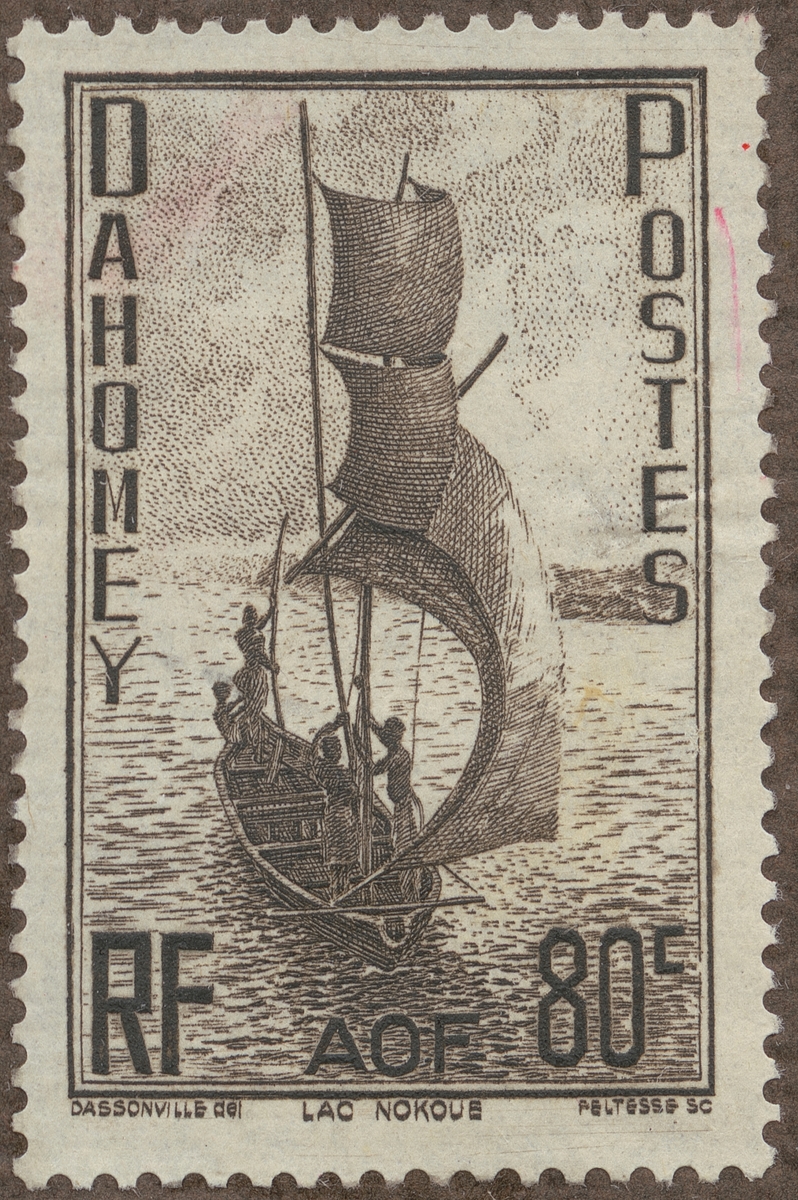 Frimärke från Dahomey, 1941. Motiv av segelbåt på sjön Nokoué Afrika