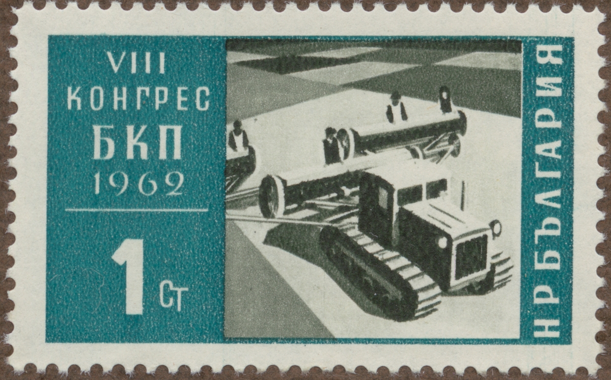 Frimärke från Bulgarien, 1962. Motiv av Traktor m.m. i det bulgariska lantbruk. "Serie: VIII Kommunistkongress i Bulgarien."