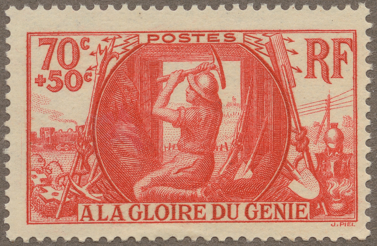 Frimärke från Frankrike, 1939. Motiv av Fransk hyllning till ingeniörsvetenskapen. Kolgruvearbetare i en ort. Gevär. Symbol för kemi, telegrafi och telefoni, sjöfart, järnvägar, lantbruk m.m.