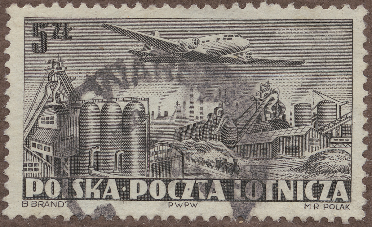 Frimärke från Polen, 1952. Motiv av Stort polskt järnverk -Tvåmotorigt monoplan-