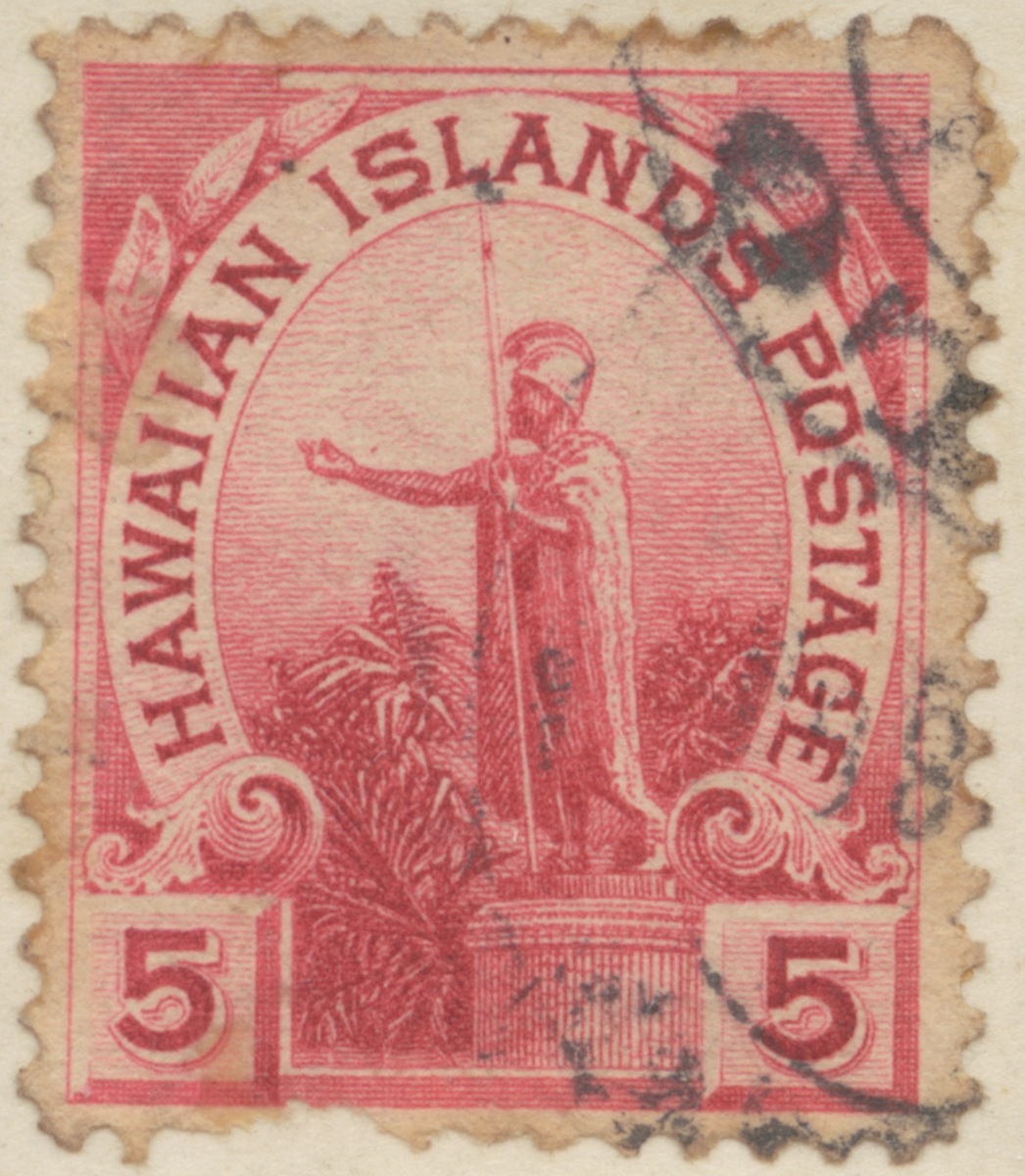 Frimärke från Hawaii, 1894. Motiv av Staty av: Kung Kamehameha I. framför Iolani palatset i Honolulu.