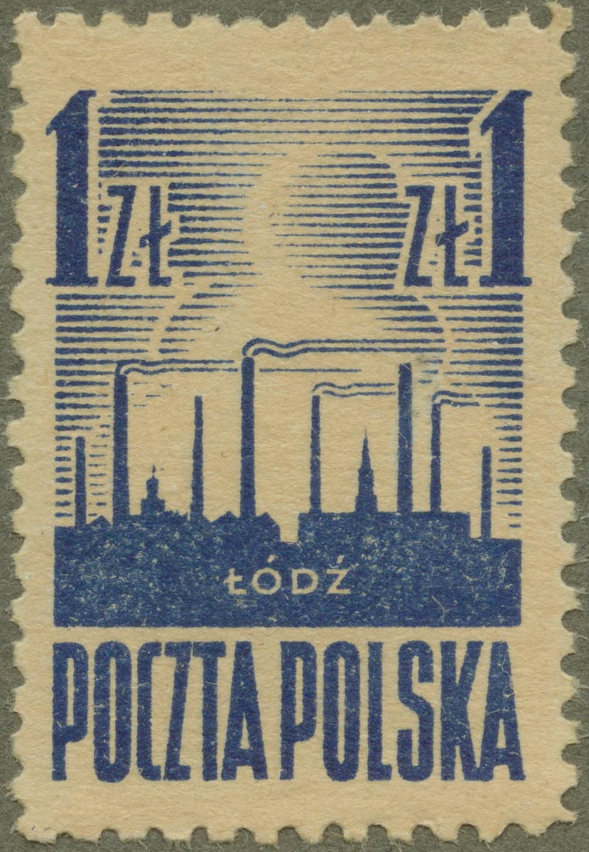 Frimärke ur Gösta Bodmans filatelistiska motivsamling, påbörjad 1950. Frimärke från Polen, 1945. Motiv av Fabriker i staden Lodz i Polen. "- Minne om Lodz:s frigörelse - 1945."