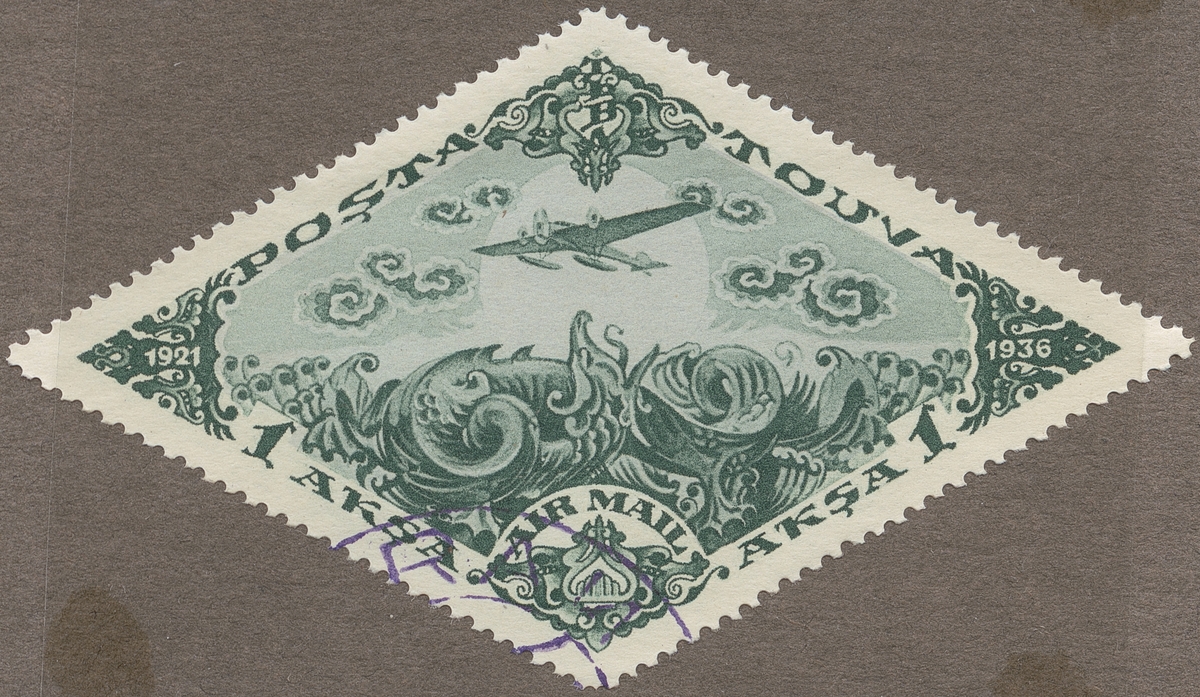 Frimärke från Touva, Mongoliet, 1936. Motiv av Tremotorigt hydroplan "15-årsjubileum av autonoma republiken Touva:s tillblivelse: 1921-1936."