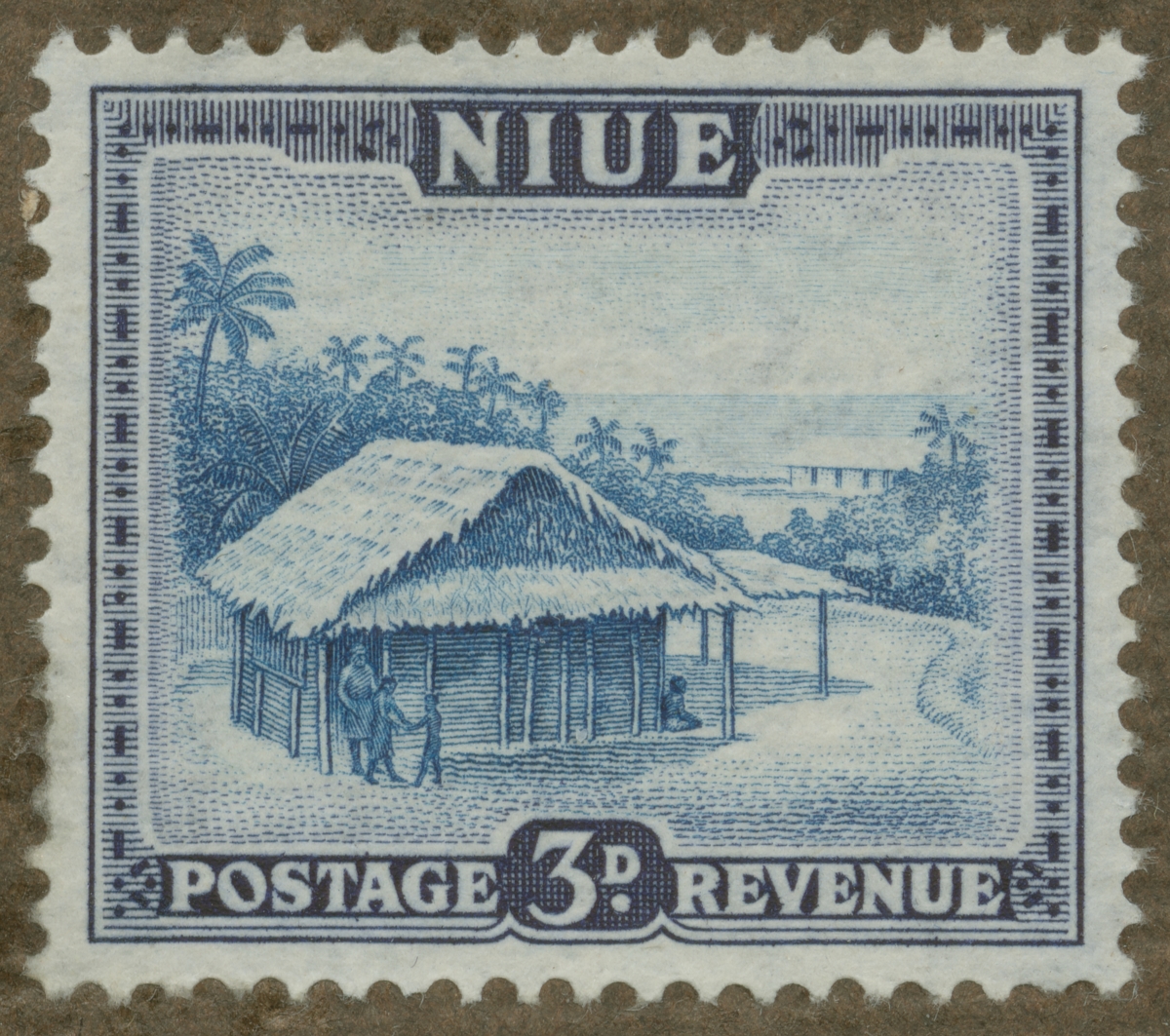 Frimärke från Niue, 1950. Motiv av hydda i Niue, Stilla havet.