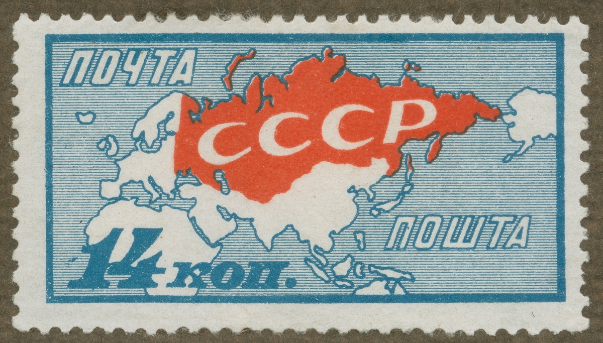 Frimärke från Ryssland, 1927. Motiv av karta över Sovjetunionen, Europa och Asien. "10 årsminne om Oktoberrevulutionen 1917".
