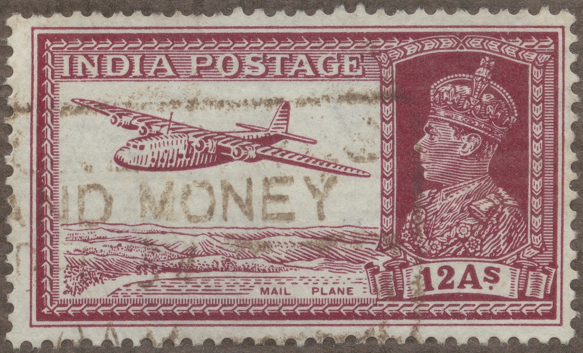 Frimärke från Brittiska Ostindien, 1937. Motiv av Fyrmotorigt monoplan för luftpost. - Kung George VI.-