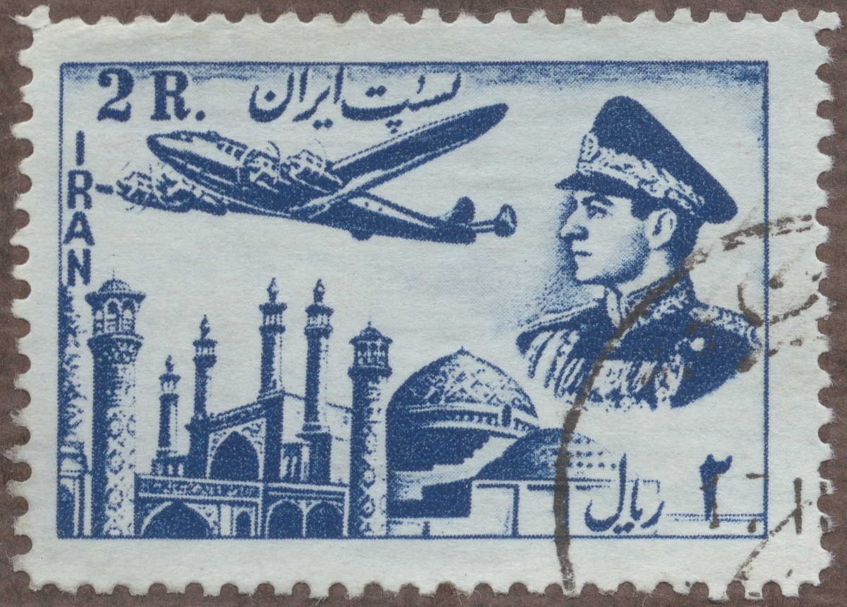 Frimärke från Iran (Persien), 1952. Motiv av 4-motorigt monoplan över minaretbyggnad -Shah Riza Pahlavi-