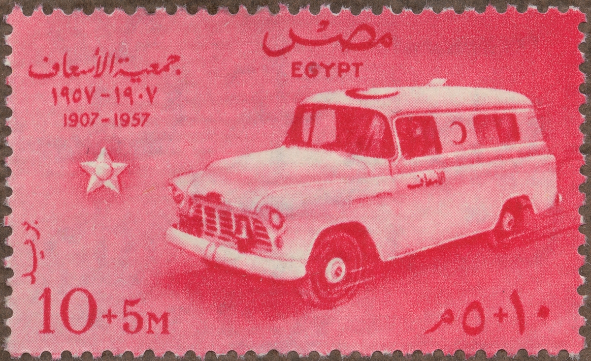 Frimärken ur Gösta Bodmans filatelistiska motivsamling, påbörjad 1950. Frimärke från Egypten, 1957. Motiv av Egyptisk ambulans: modell 1957 "50-årsminne av grundandet av: "Public Aid Society" 1907-1957."