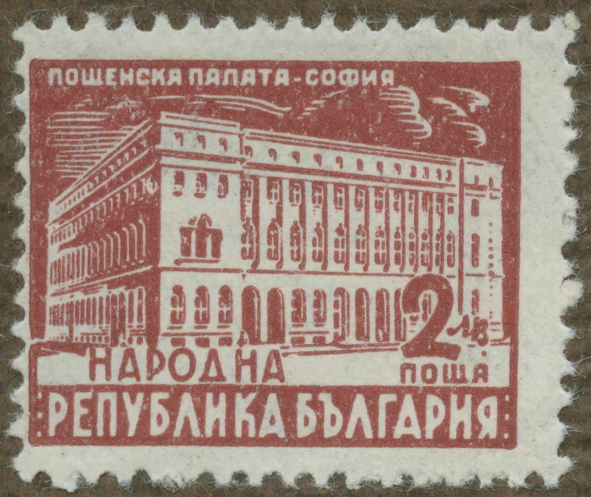 Frimärke från Bulgarien, 1947. Motiv av Poststyrelsen byggnad i Sofia.