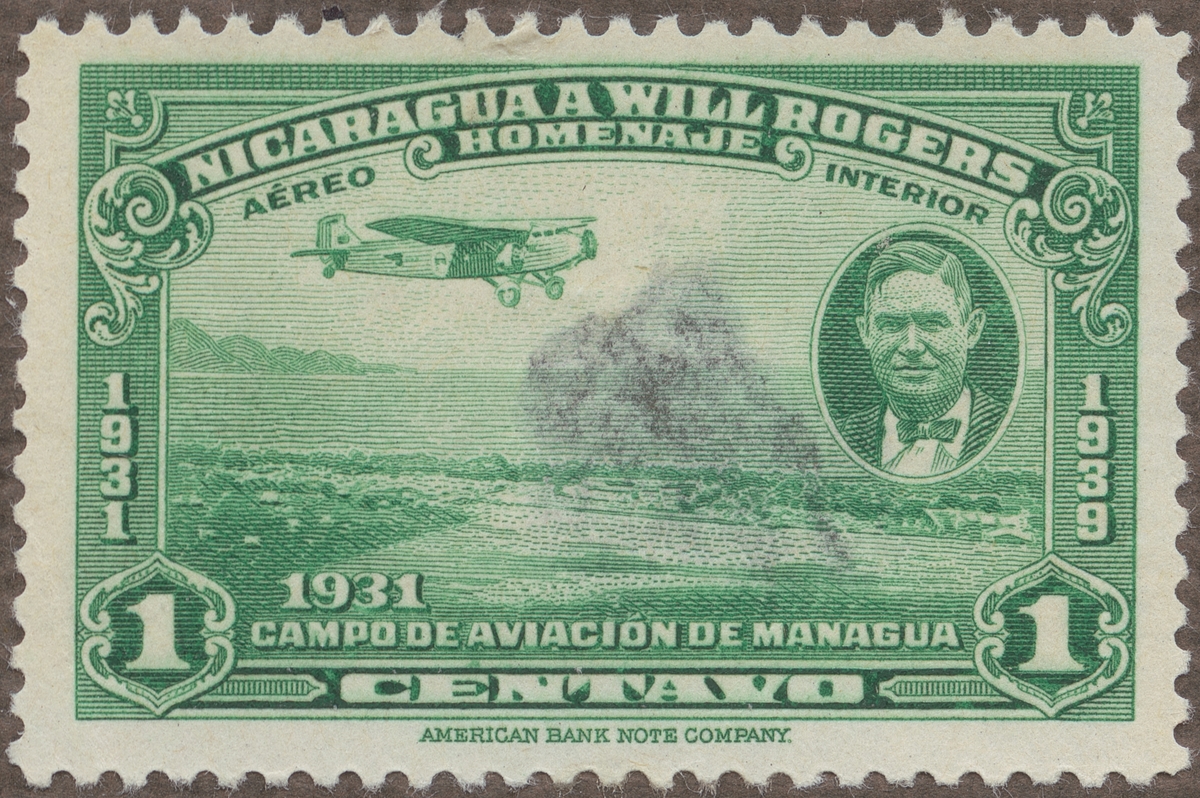 Frimärke från Nicaragua, 1939. Motiv av Flygfältet vid Managua i Nicaragua. "Serie: hyllning åt amerikanska filantropen, Will Rogers (t.h.) som ankom med hjälp till landet efter jordbävningen i Managua, 1931. - 8-årsminne-"
