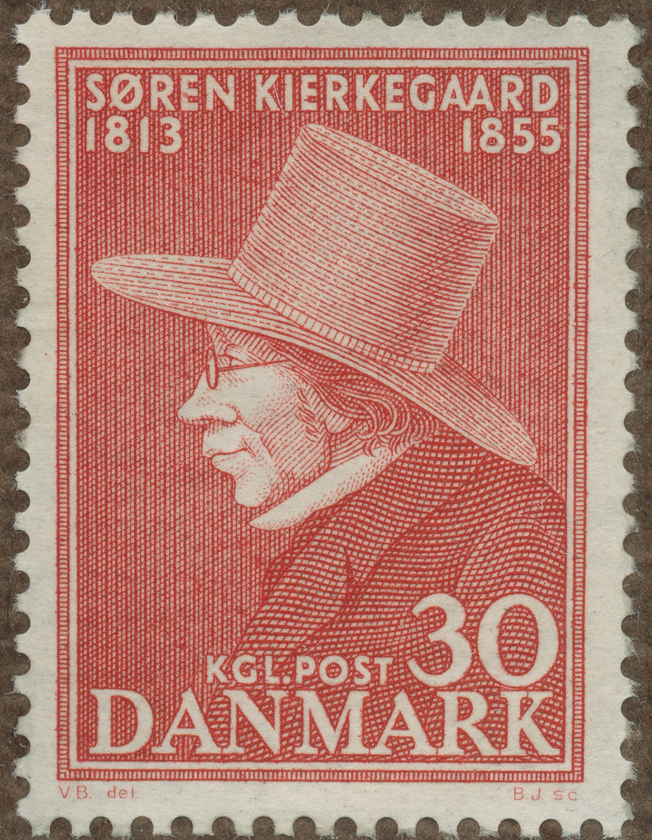 Frimärke från Danmark, 1955. Motiv av Sören Kierkegaard 1813-1855. Dansk religionsfilosof och författare 100-årsminne av hans död. 1855-1955.