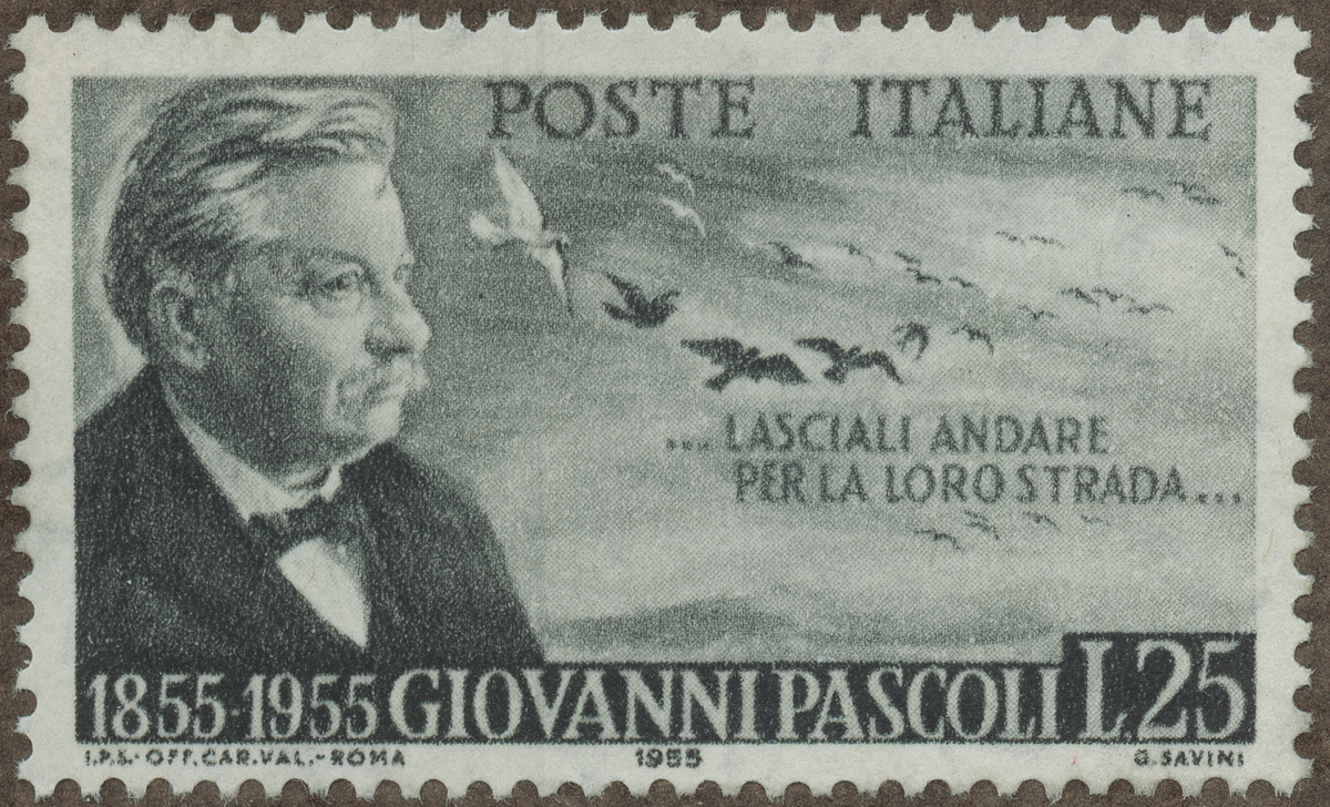 Frimärke från Italien, 1955. Motiv av Italienaren Giovanni Pascoli 1855-1912. Författare och skald. -100-årsminne av hans födelse: 1855-1955-