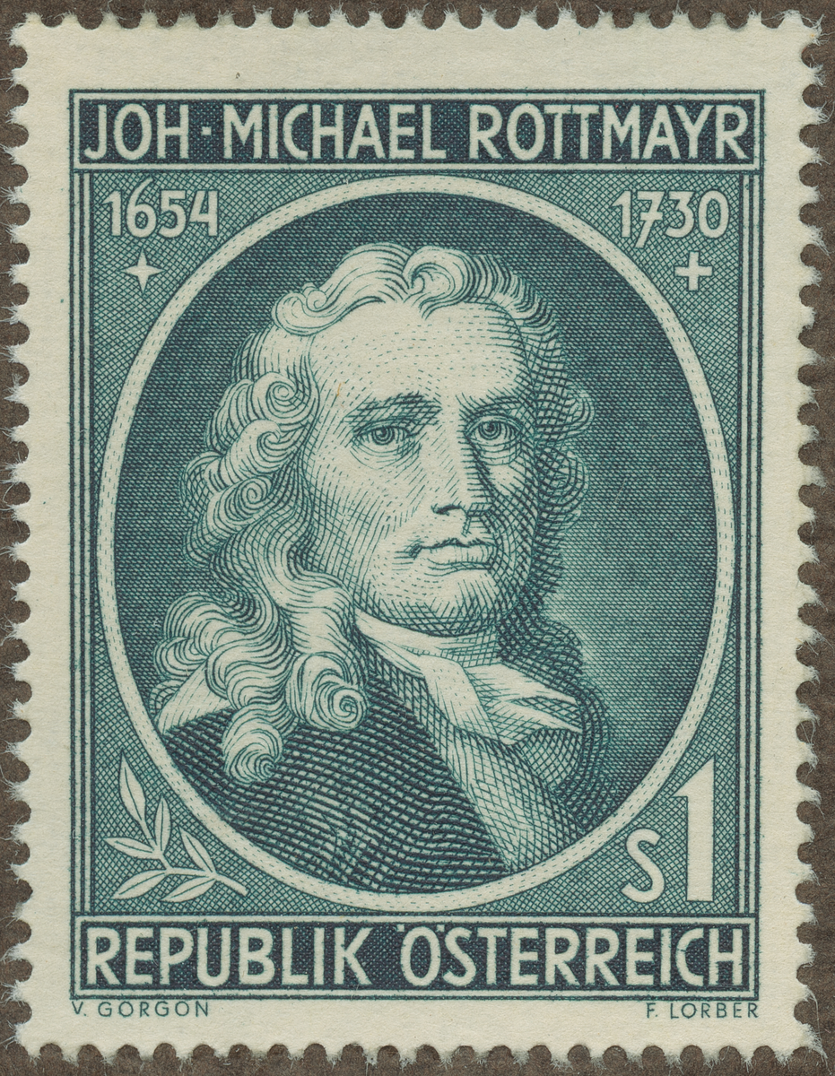 Frimärke från Österrike, 1954. Motiv av Joh. Michael Rottmayr: 1654-1730. Barock freskmålare: Schloss Schönbrunn. Peterskirche och Karlskirche, Wien. 300-årsminne av hans födelse: 1654-1954.