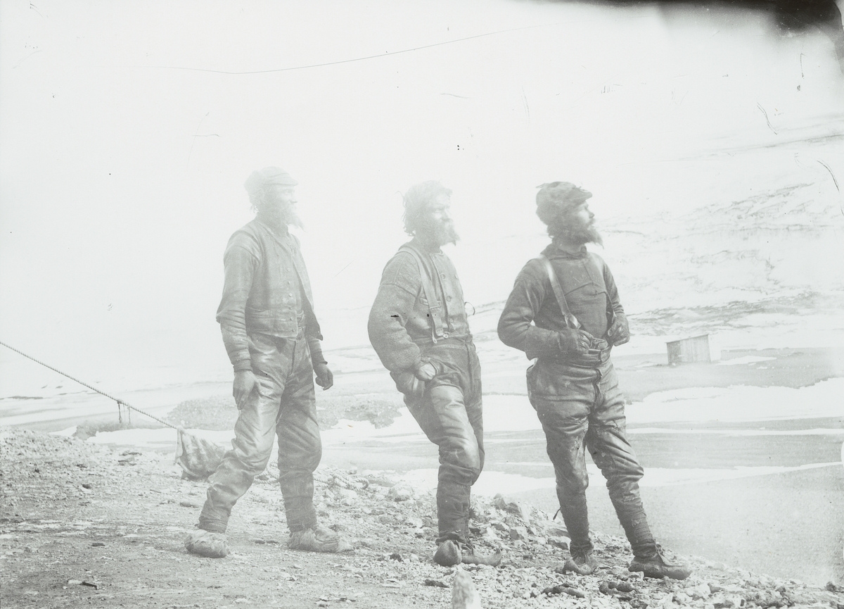 Fotografi från första svenska Antarktisexpeditionen 1901-1904. Motiv av expeditionsdeltagarna Johan Gunnar Andersson, Samuel Duse och Toralf Grunden vid Hope Bay.