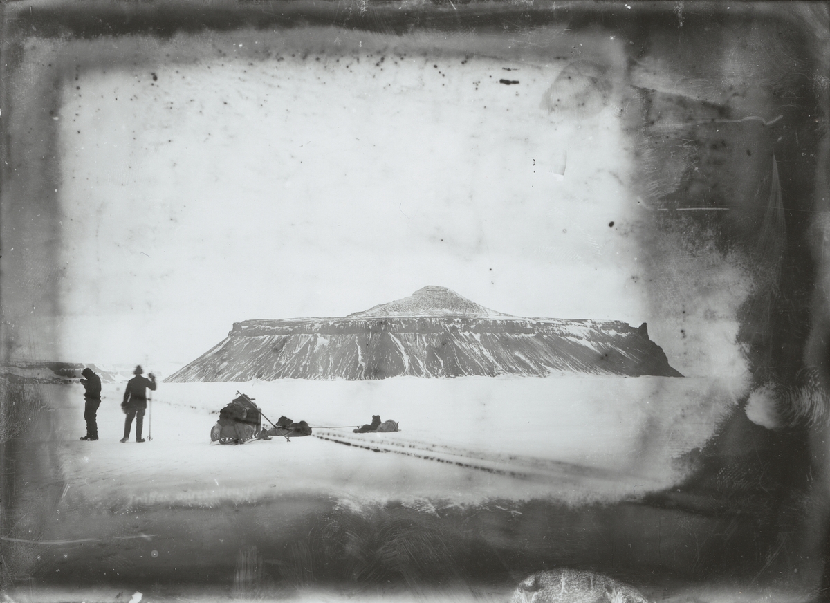 Fotografi från första svenska Antarktisexpeditionen 1901-1904. Motiv av män med hundsläde i snölandskap vid berg.