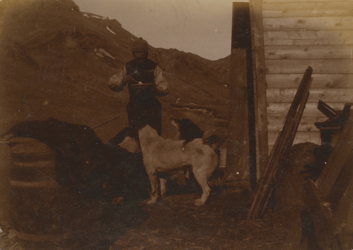 Fotografi från första svenska Antarktisexpeditionen 1901-1904. Motiv av man med hundar, slädar och packning utanför hus.