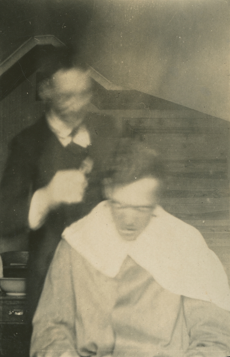 Fotografi från expedition till Spetsbergen. Motiv av man som får sitt hår klippt av en annan man.