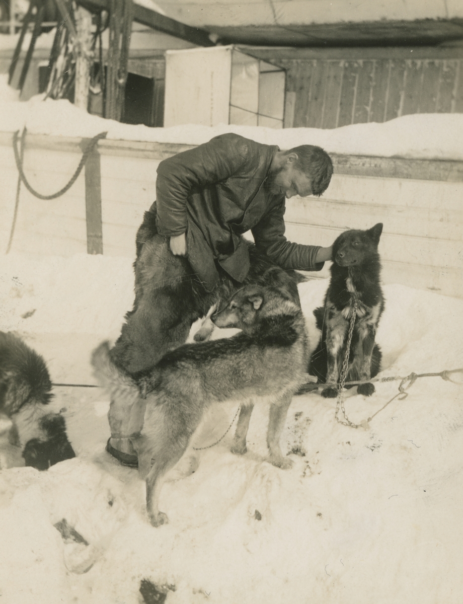 Fotografi från Maudexpeditionen. Motiv av Finn Malmgren och hundspann år 1925.