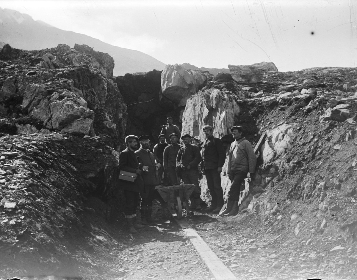 Fotografi från Grönland. Motiv av gruvarbetare vid ingång till gruva.