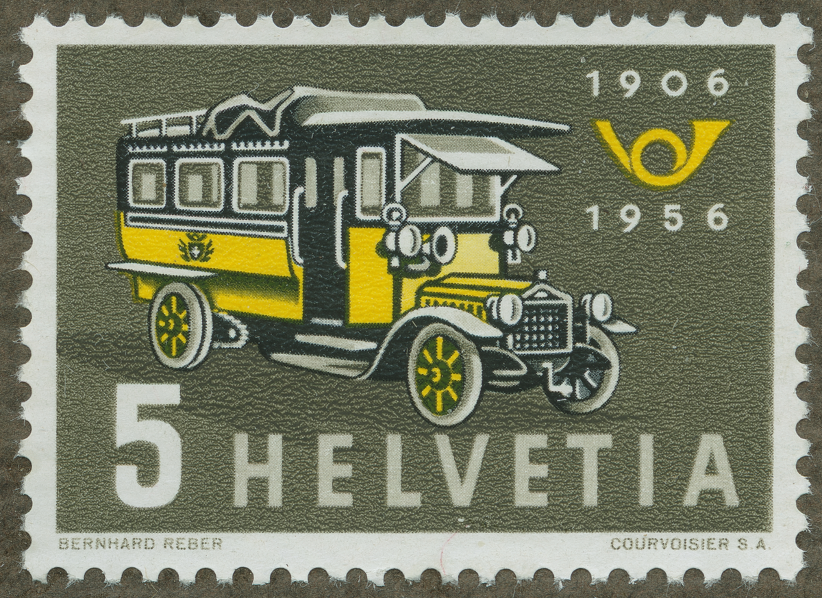 Frimärke från Schweiz, 1956. Motiv av Gammal postbil 1906-1956. "Trafikserie"