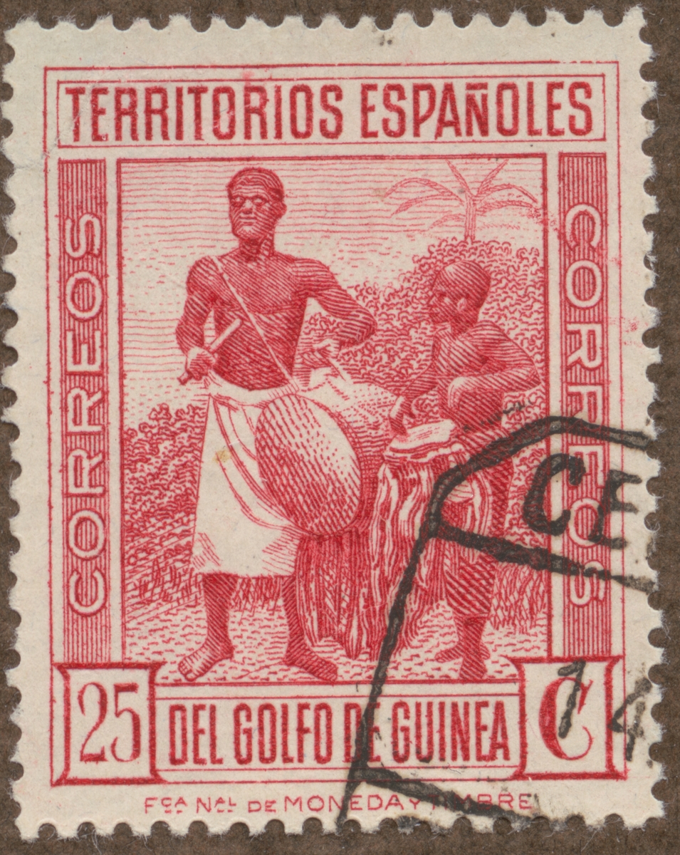 Frimärke från Spanska Guinea, 1931. Motiv av män med signaltrummor.
