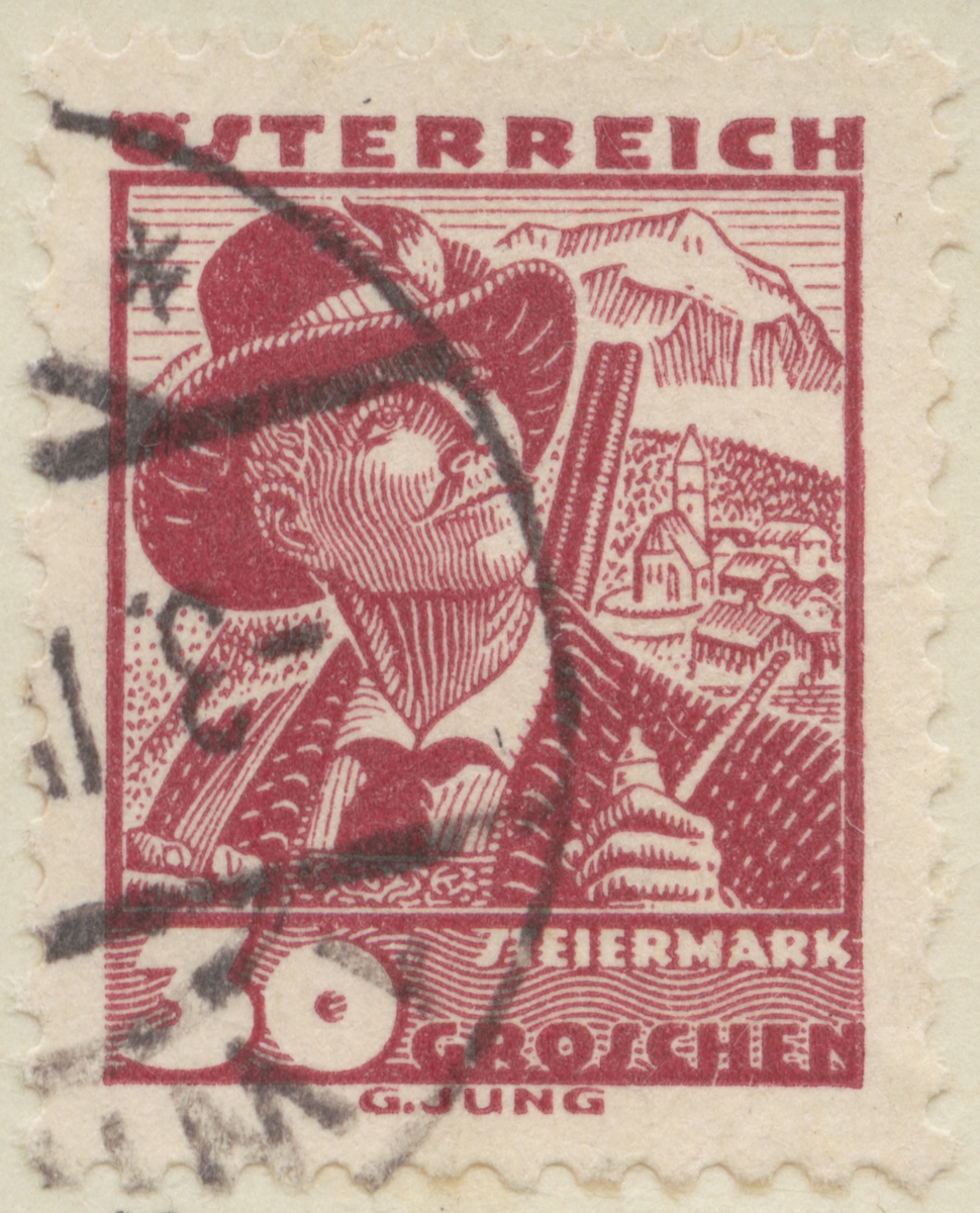 Frimärke från Österrike, 1934. Motiv av mansdräkt, Steiermark.