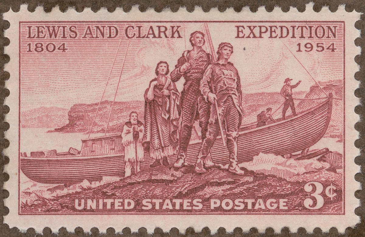Frimärke från U.S.A., 1954. Motiv av Enkel Fiskebåt -Landstigning vid Missourifloden- 150-årsminne av Lewis & Clark expeditionen: 1804-1954.