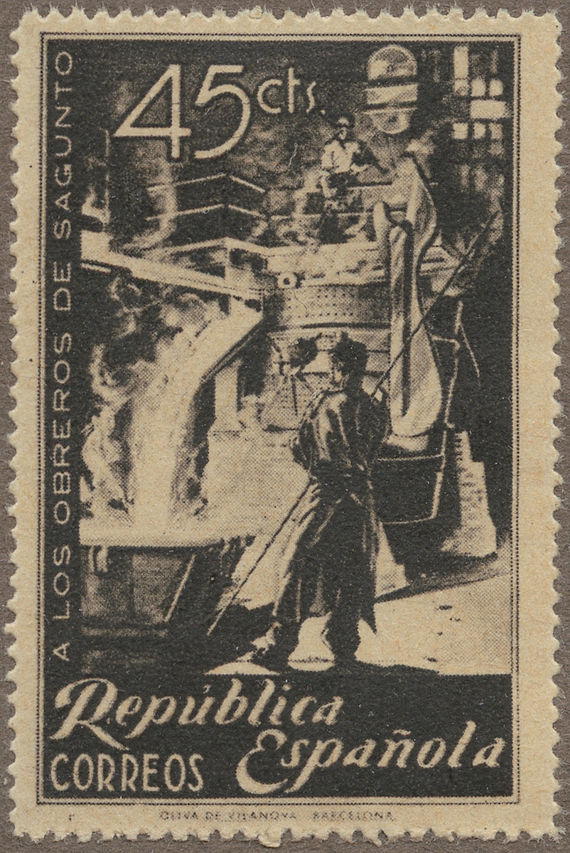 Frimärke från Spanien,1938. Motiv av Tappning av stålugn, Spanien 1938.