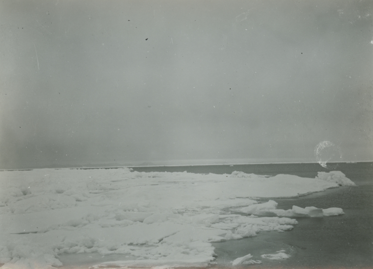 Fotografi från expedition till Östgrönland 1929. Dansk-svensk expedition under ledning av Lauge Koch. Svenska deltagare: Oscar Kulling och Helge Backlund. Vy över ett snö- och islandskap vid havet.