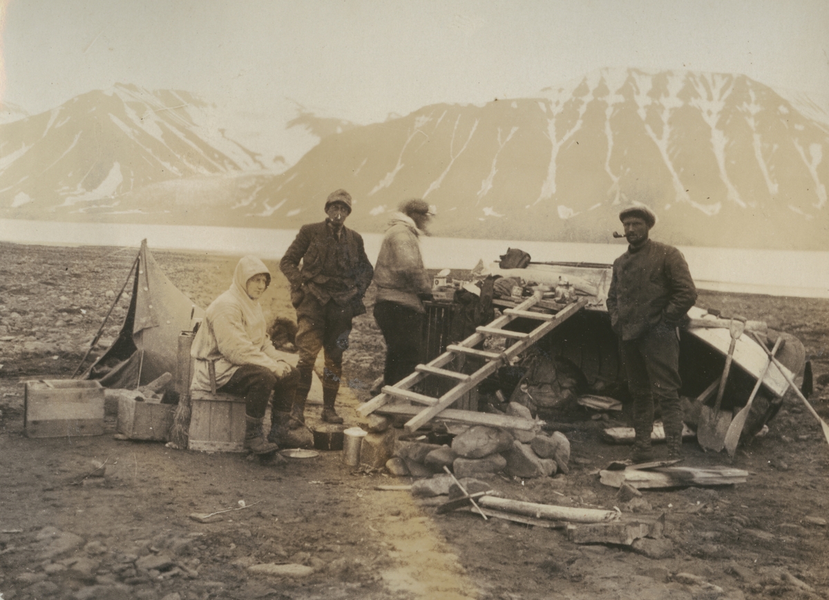 Fotografi från expedition till Sveagruvan. Motiv av fyra expeditionsdeltagare vid lägerplats på stenig strand nedanför berg.