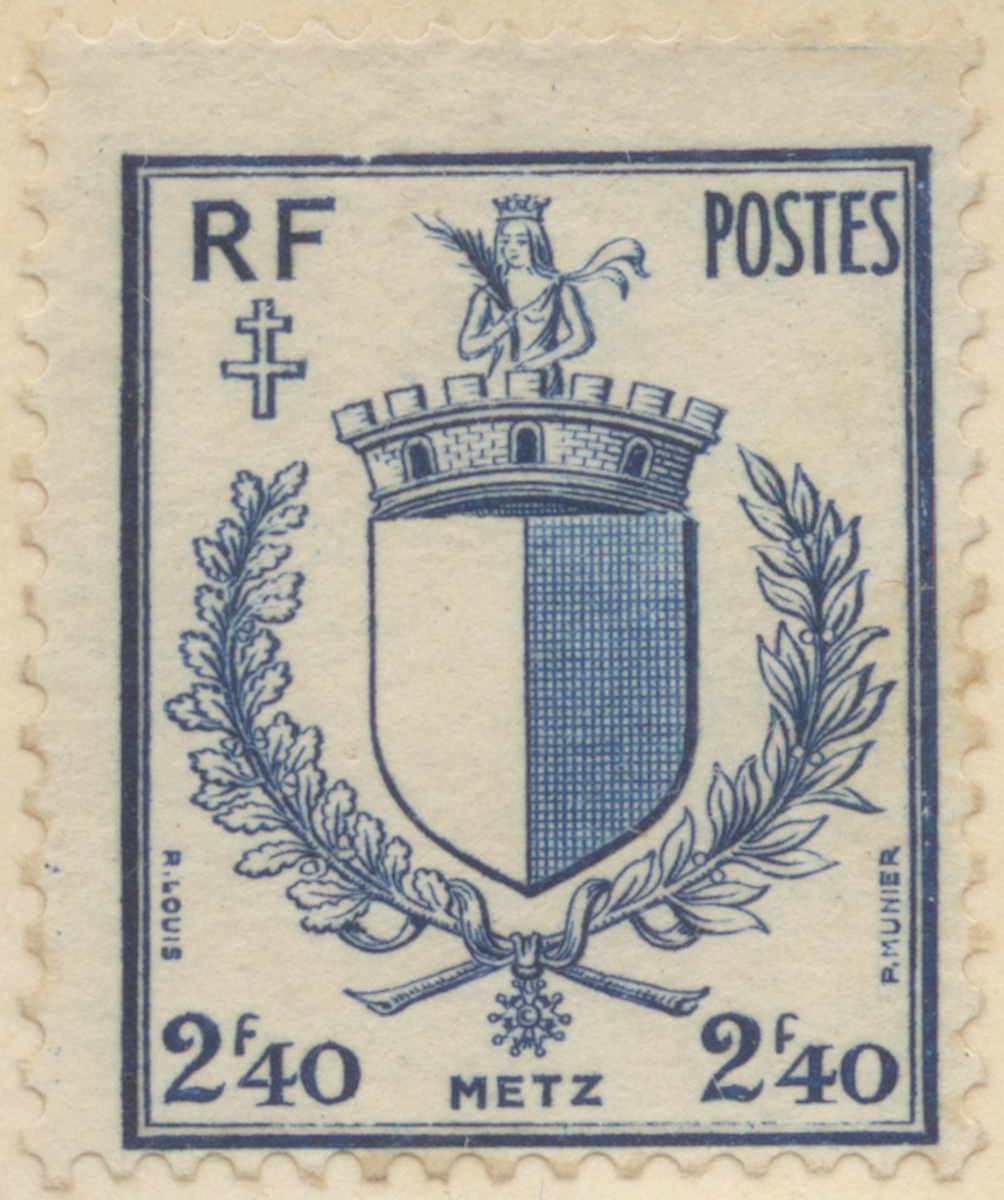 Frimärke från Frankrike, 1945. Motiv av Vapen Staden Metz "Serie: Alsace och Lorraine städernas vapen."
