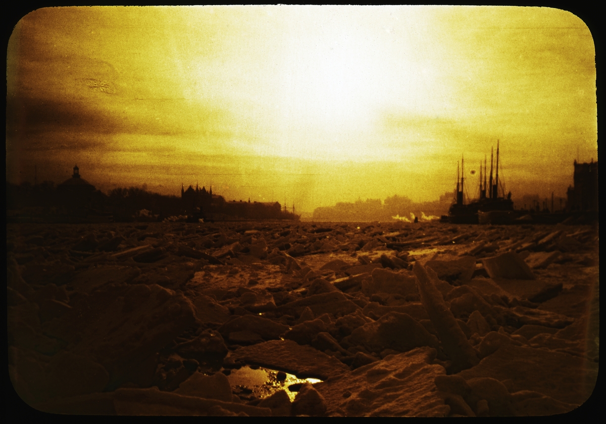 Stockholms stad. Islossning. Till vänster: Skeppsholmskyrkan och Amiralitetshuset. (Silveromvandling, pga fukt och luft, kan ha gett bilden den gulbruna färgen.)
