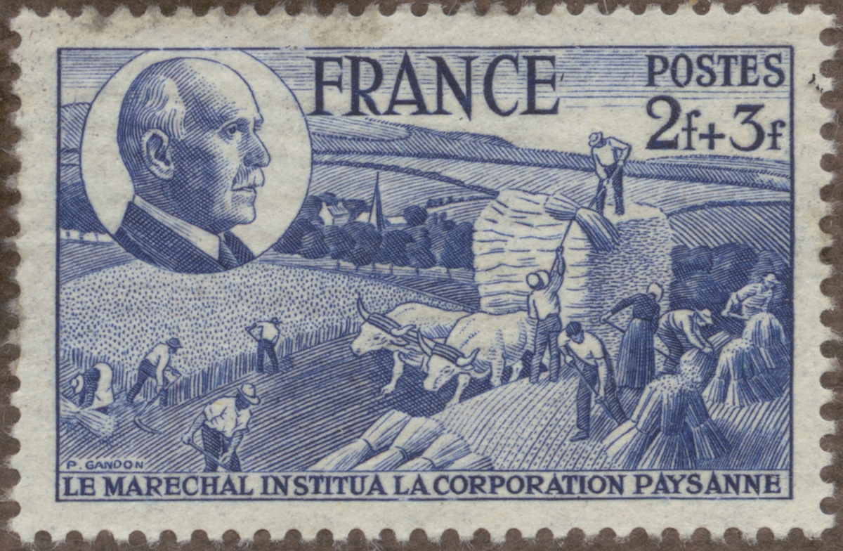 Frimärke från Frankrike, 1944. Motiv av Franskt skördearbete med oxar som dragkraft. (ovan t.v.) Marskalk Henri Philippe Pétain: 1856-1951): "Serie:-Till Pètains 88-nde födelsedag: 1944-"