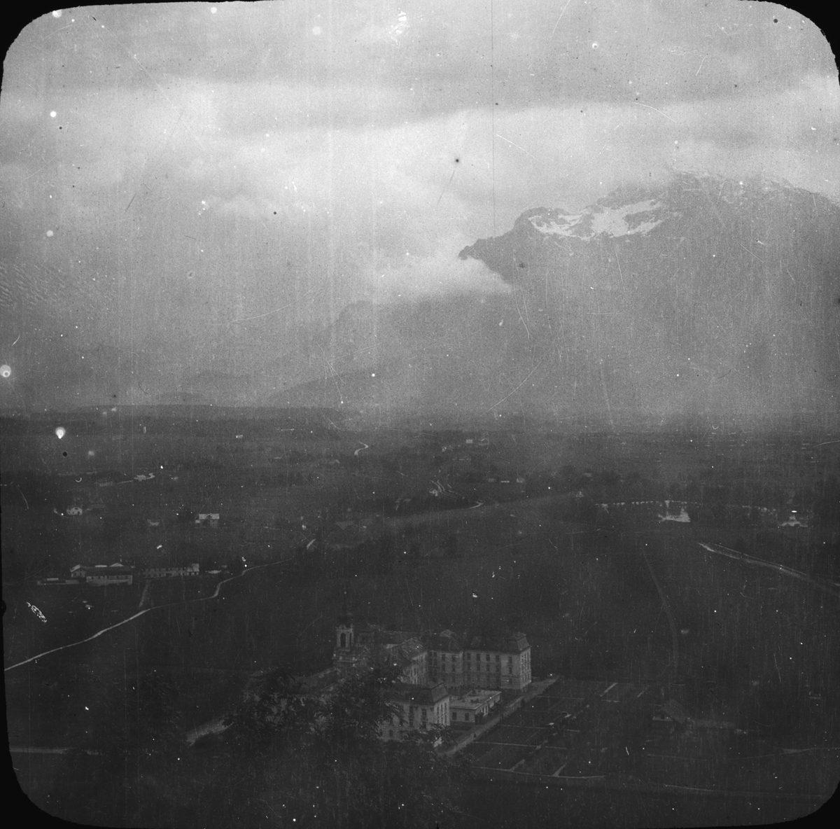 Skioptikonbild med motiv av vy över Salzburg med Alperna i bakgrunden.