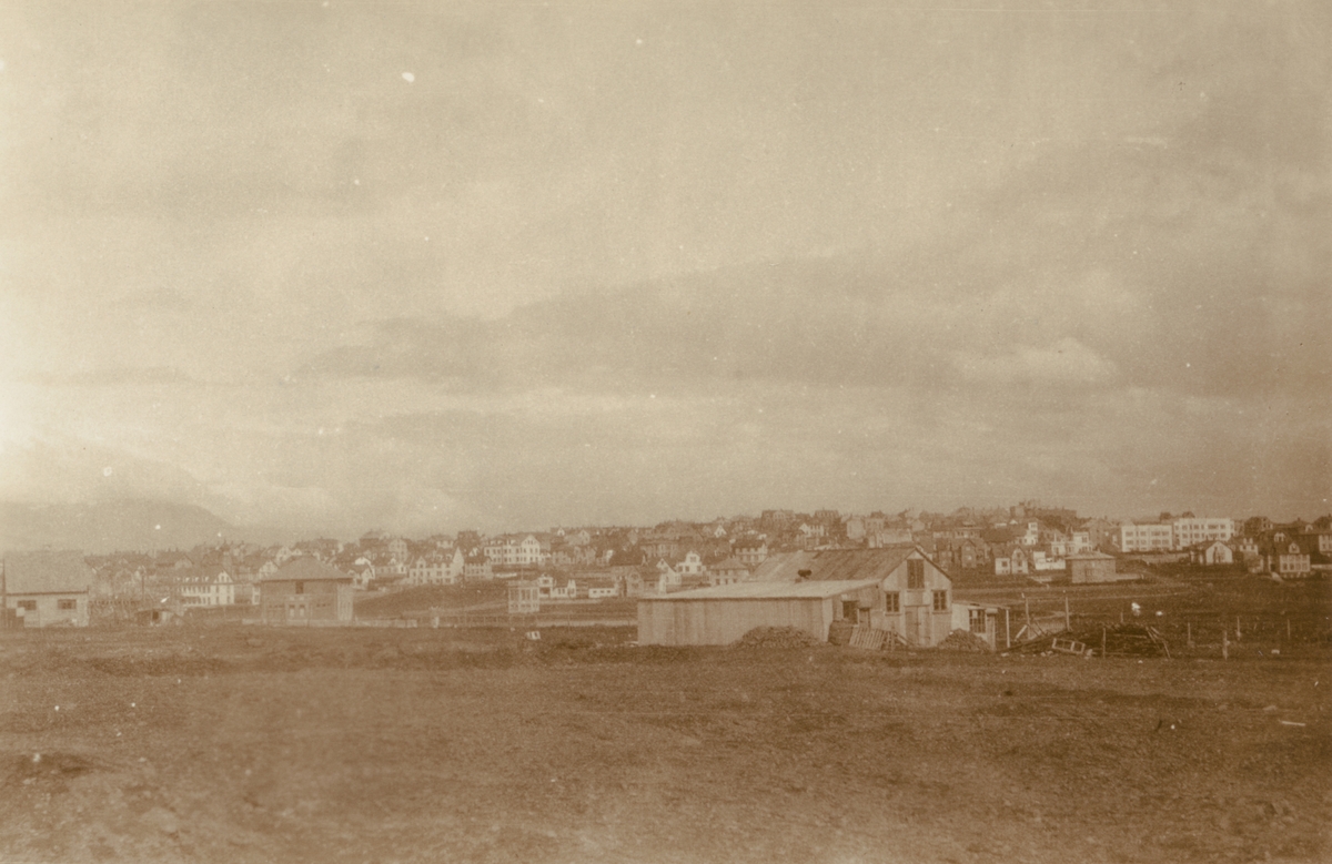 Fotografi från Albin Ahrenbergs resa till Grönland 1929. Vy över landskap, stad och himmel.