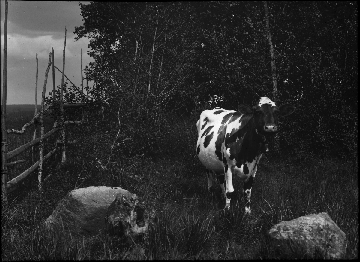 Diapostiv, fönster-bild av ko i hage.