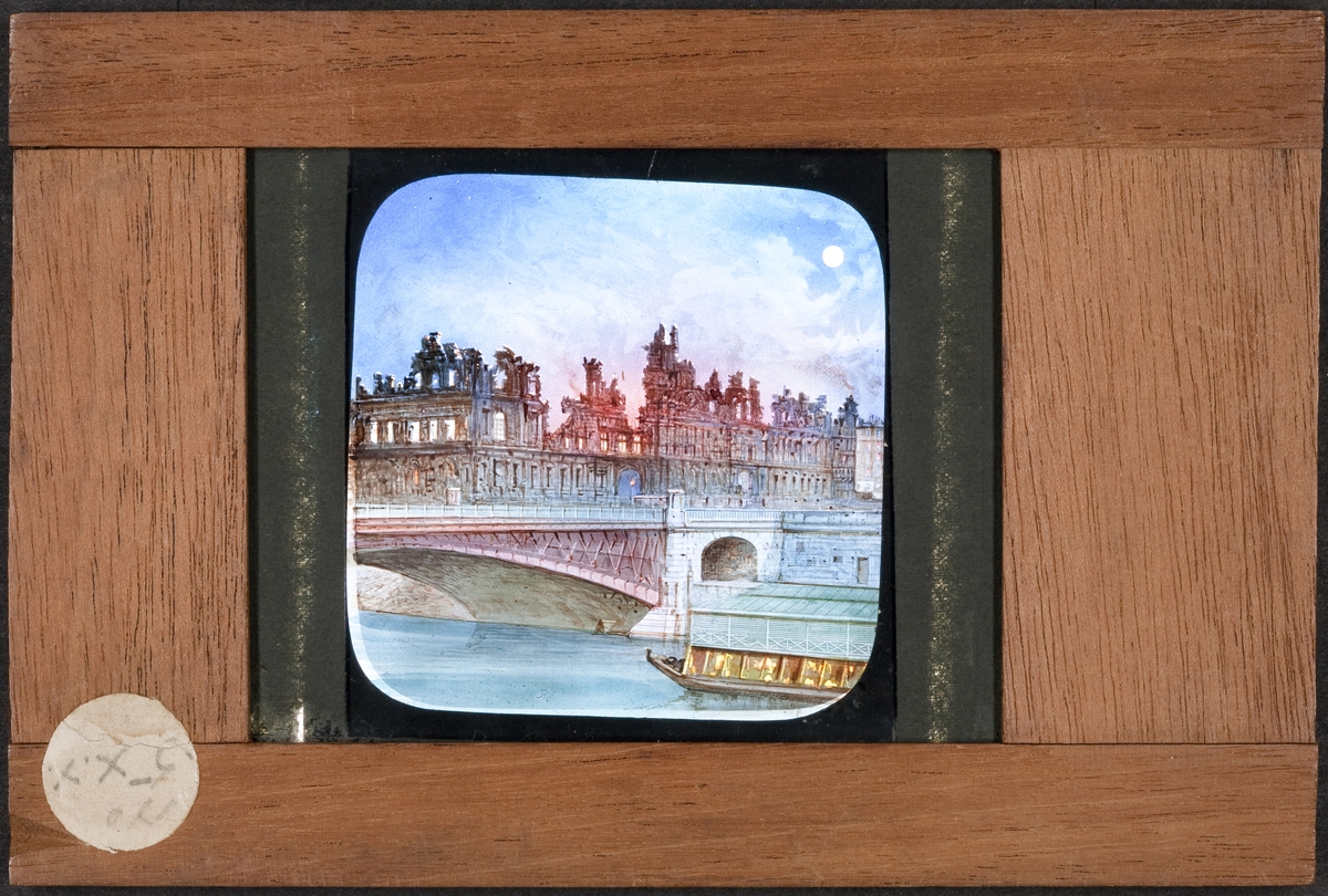 Ljusbild för laterna magica med motiv av Hotel de Velle, efter eldsvådan.
