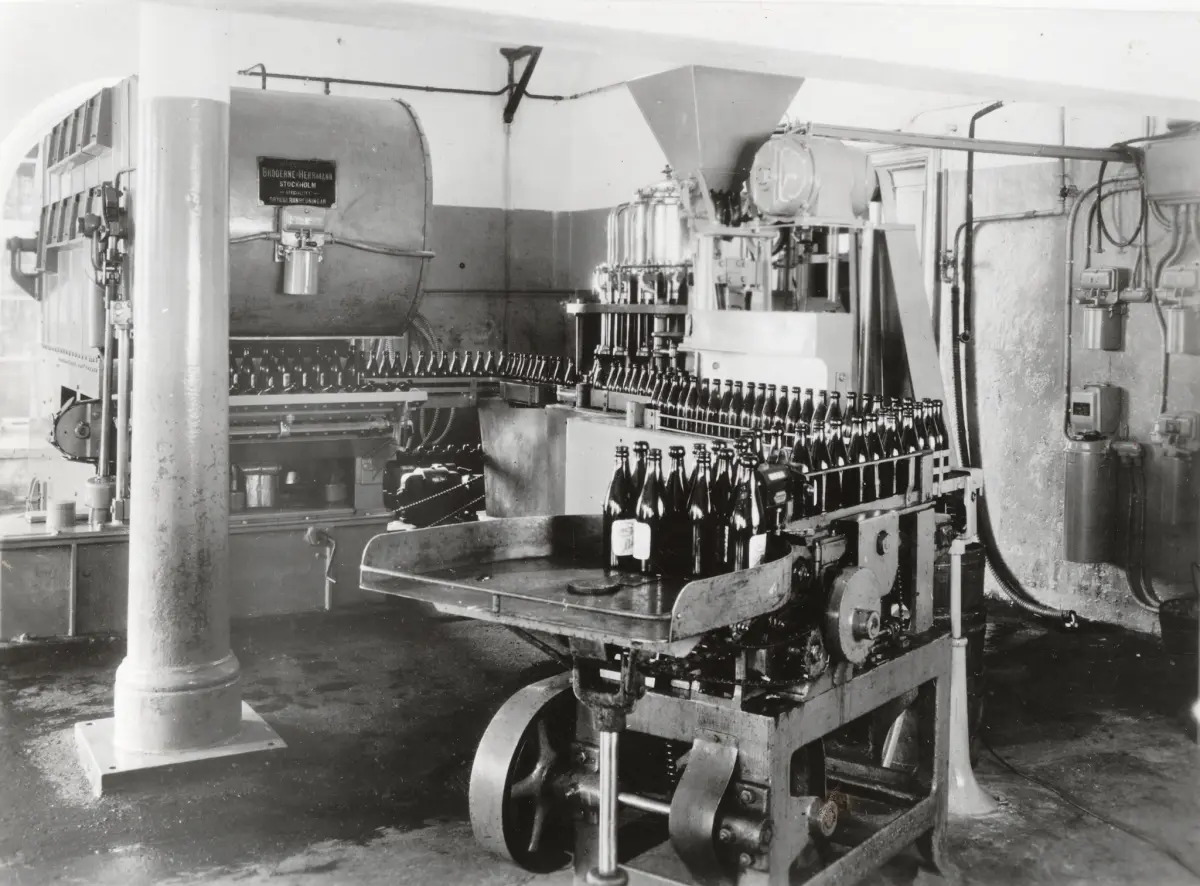 Helautomatisk skölj-, tappnings-, korknings- och etiketteringsanläggning för maltdrycker läskedrycksfabriken vid AB Luleå Bryggeri, Västerbotten.