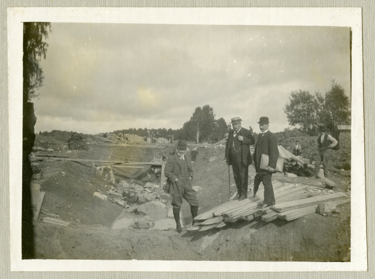 Grävningen av kanalen till Gisslarbo Kraftstation 1913. Personerna på bilden från vänster är direktör Oscar Falkman, brukspatron Anton Ohlson samt ingenjör Paul Andersson.