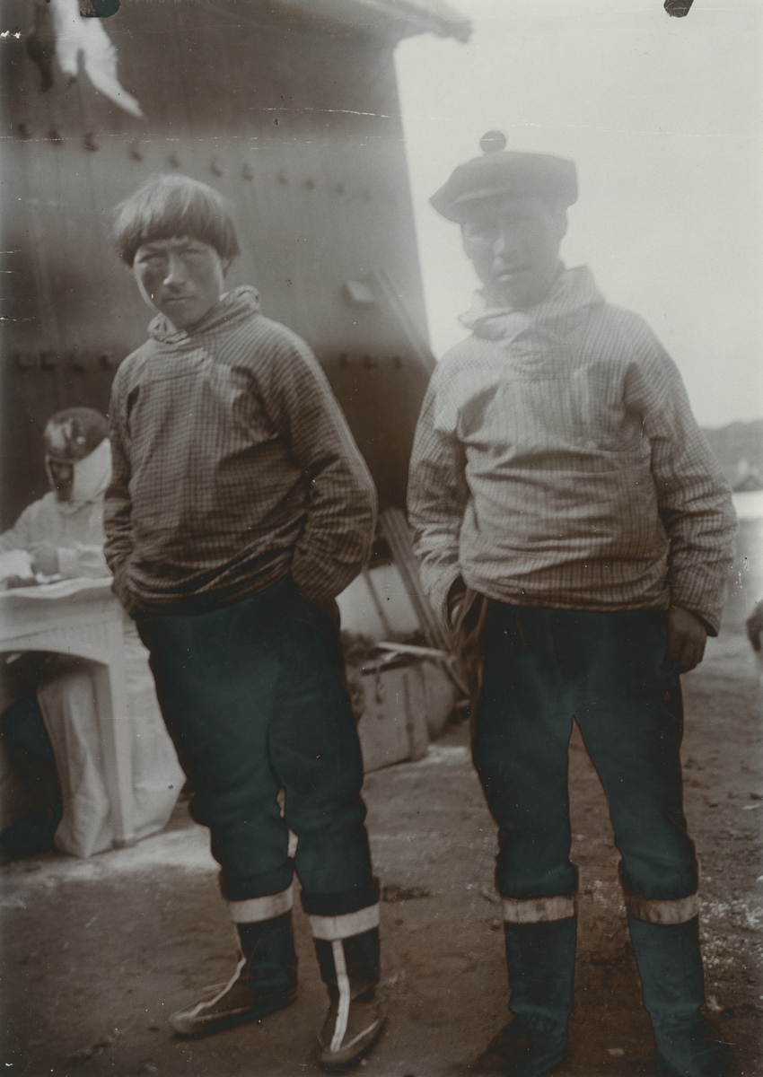 Fotografi från expedition till Grönland. Två män iklädda rutiga huvjackor poserar på en kaj.