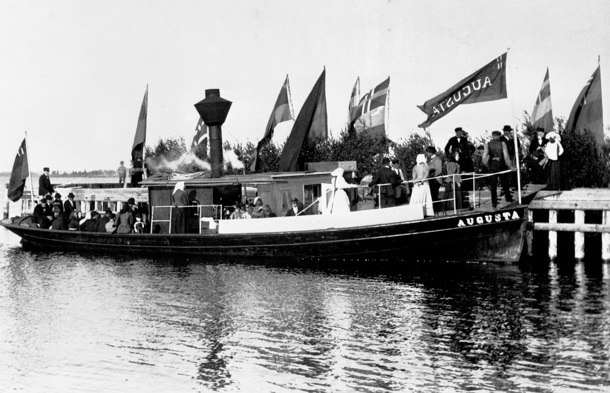 Utflykt med båt för sågverksarbetare vid Holmsunds sågverk i Obbola, Holmsund, Västerbotten. Bilden märkt "Fotogrfisk stipendiat. 1905".