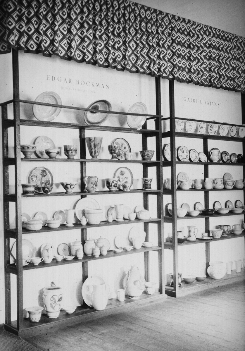 Skioptikonbild med motiv från Göteborgsutställningen 1923. Montrar med porslin av Edgar Böckman och Garbriel Fajans.