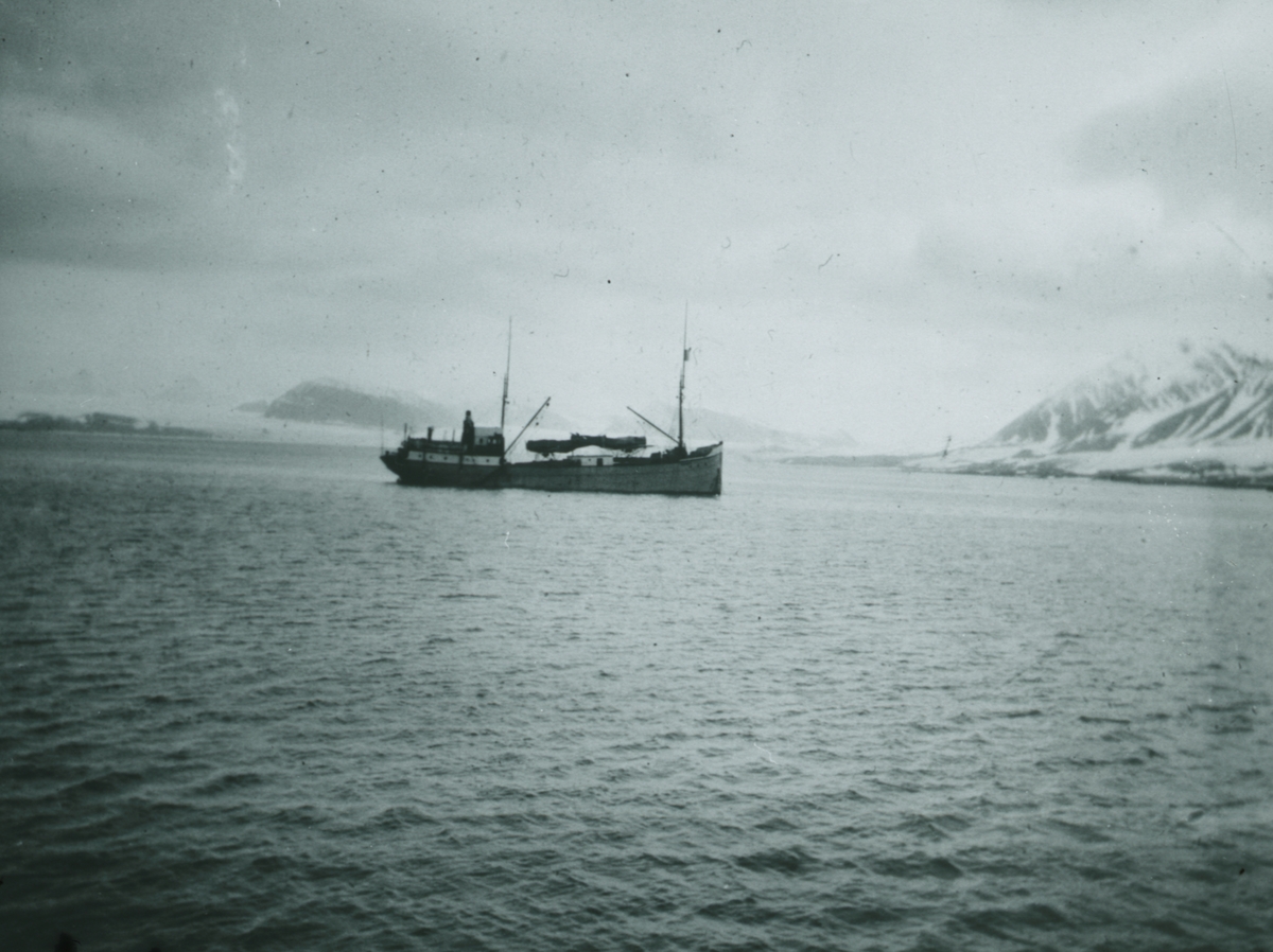 Glasnegativ med motiv av åkande båt i snöigt bergslandskap.
