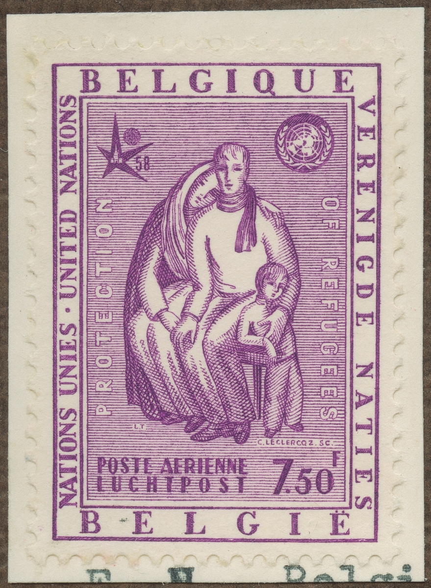Frimärke från F.N., 1958. Motiv av Internationella Flyktinghjälpen Bryssel Utställn. 1958