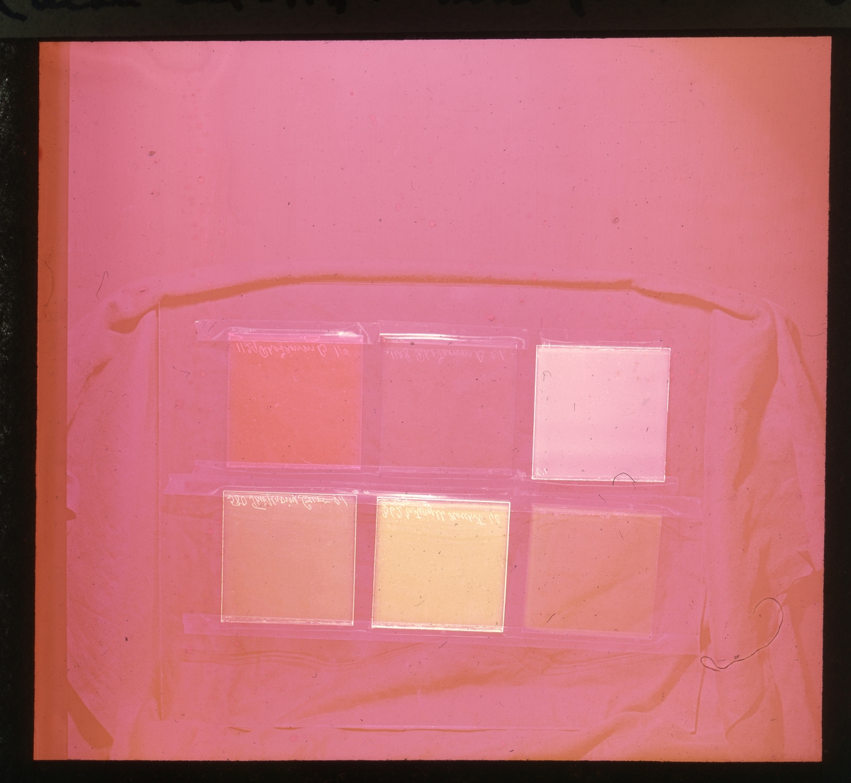 Skioptikonbild från institutionen för fotografi vid Kungliga Tekniska Högskolan. Använd av professor Helmer Bäckström som undervisningsmaterial. Bäckström var Sveriges förste professor i fotografi vid Kungliga Tekniska Högskolan 1948-1958. Floursescens. (Se mer text på bilden) För mer info: Se Fotografisk Handbok av Helmer Bäckström. Natur och Kultur. Andra omarbetade upplagan 1958-59 Kap 147 Flourescensanalys och flourescensfotografering sid 1094 och följande.