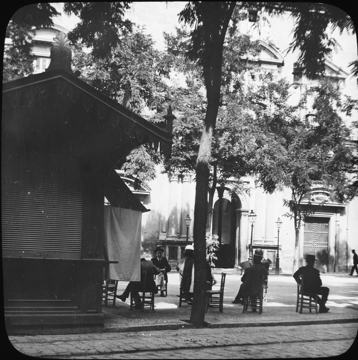 Skioptikonbild med motiv från Granada. Män sittande på café på torget plaza Rodriguez Bilobar.